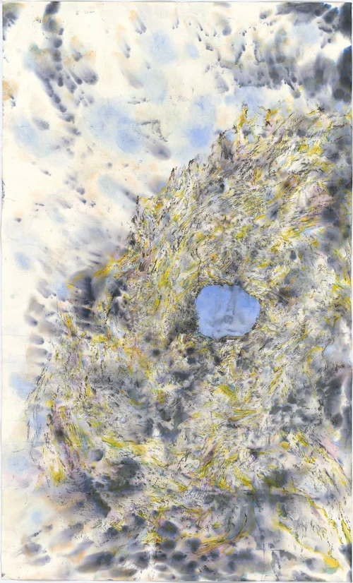 right: Water, Rock & Soul 1, European, Chinese, Japanese inks, pigments, oil pastel on Chinese paper, 35cm x 45cm, 2019.