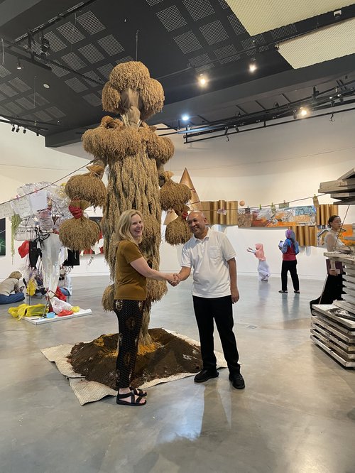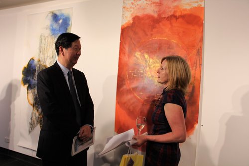 Third image: Taiwan Representative Elliott Charng who opened the exhibition Jouney in Inks at Australian Centre on China In the World Gallery 2019, seen with Ella Whateley.