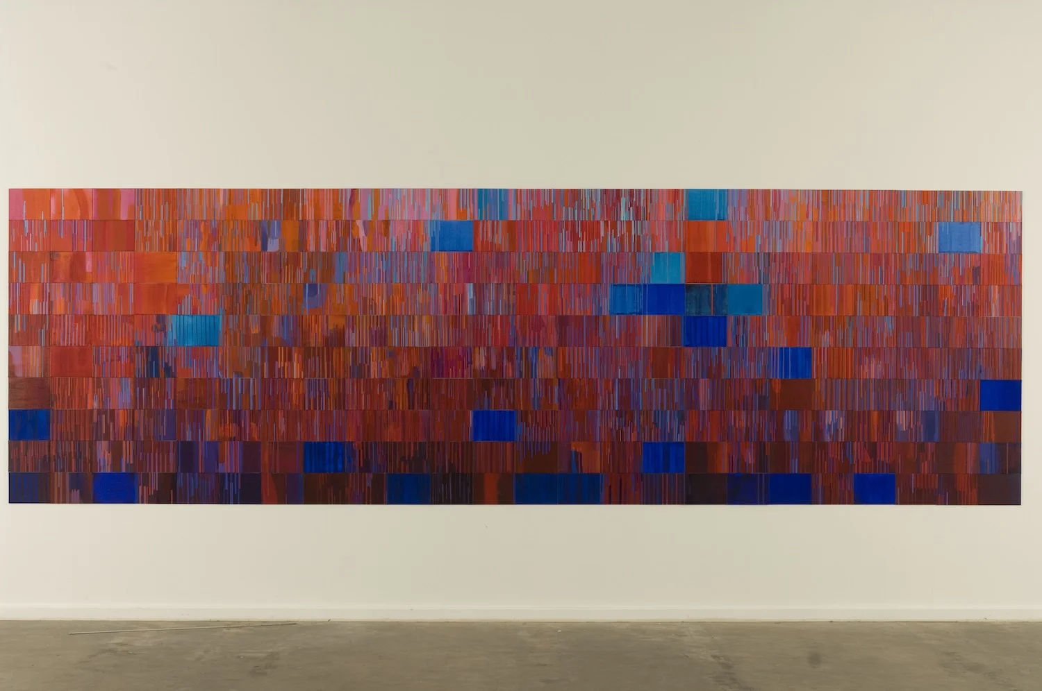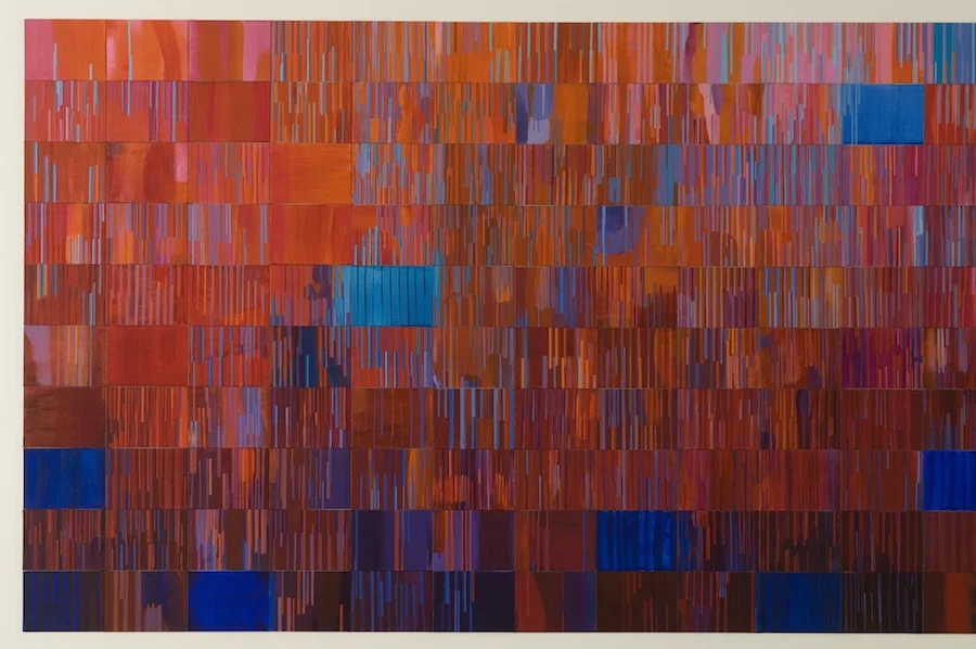 RAISING LAZARUS with blue, (below and detail), is a composite grid of 240 individual rectangular canvas boards; it is 487cm long and 152cm high, 2006. Poured and applied acrylic paint, line and colour act as metaphor in a rich story of compassion and new life in the face of death.